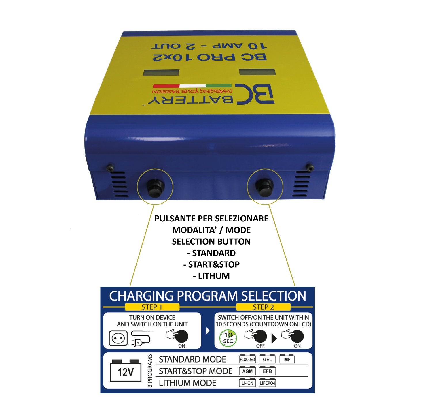 Der BC PRO 10x2 ist mit 2 10-Ampere-Ausgängen ausgestattet, mit denen bis zu 2 Batterien gleichzeitig verwaltet werden können. Um verschiedene Ladezyklen völlig unabhängig voneinander durchzuführen, kann 1 Start & Stop-Akku gleichzeitig mit einem Lithium-Akku oder einem Akku geladen werden Oldtimer-Batterie.