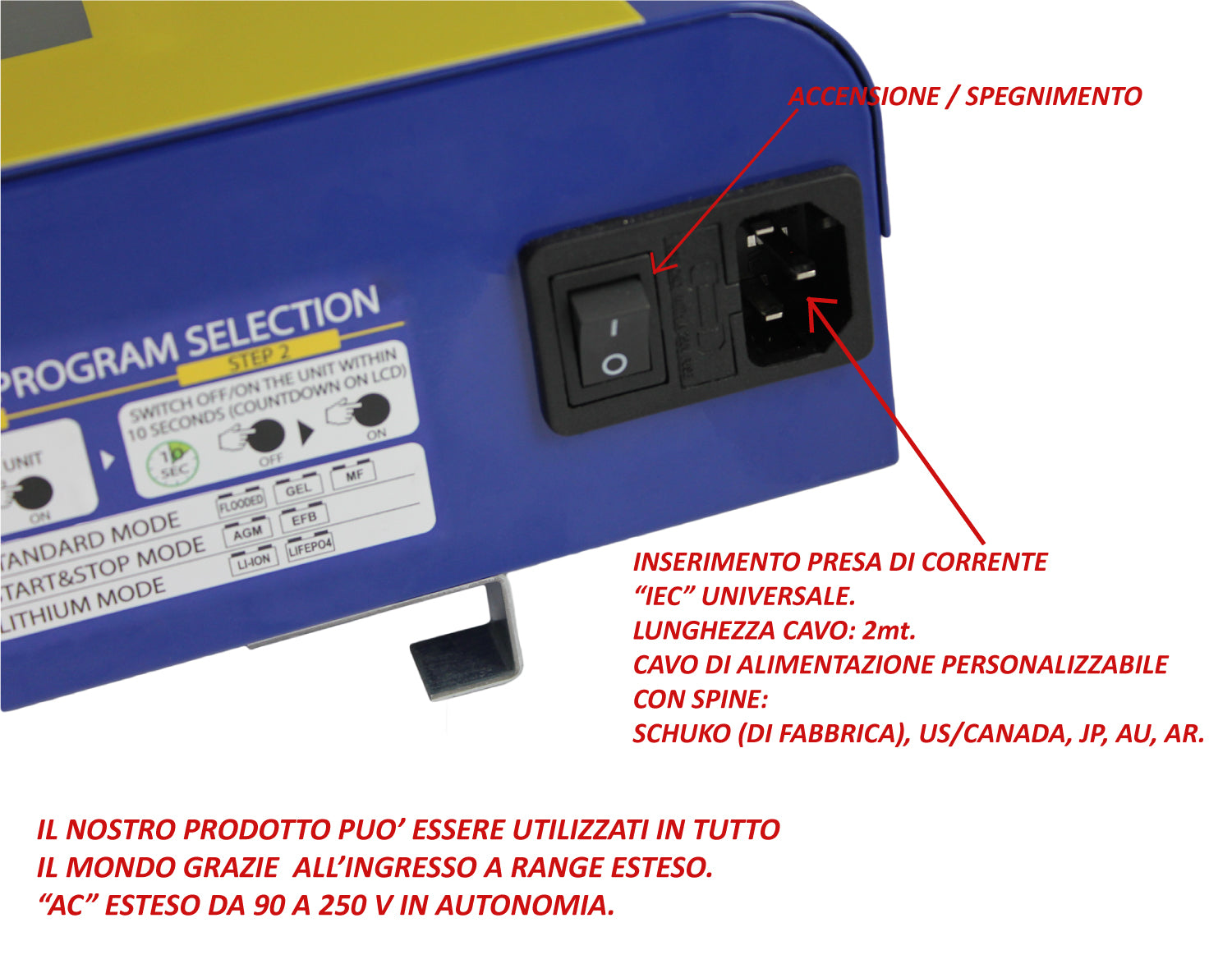 - Hintergrundbeleuchtetes LCD-Display für einfache Anzeige (auch nachts in der Ferne), das Folgendes anzeigt: den aktiven Lademodus (CAR oder LITHIUM oder START & STOP), den laufenden Ladezyklus (Laden, Desulfatieren, Wartung ...), die Batteriespannung (digitales Voltmeter) und eventuelle Betriebsstörungen (Polumkehr, Kurzschluss, Batterie nicht angeschlossen ...).
